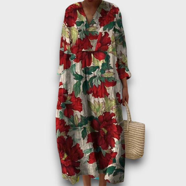 Αυτό το μακρύ φόρεμα με floral σχέδιο σε πλούσιες αποχρώσεις του κόκκινου είναι η τέλεια επιλογή για τις μέρες που θέλεις να νιώσεις θηλυκή, άνετη και εντελώς ανέμελη. Με φαρδιά και άνετη γραμμή, κρύβει απαλά την περιοχή της κοιλιάς, ενώ το ελαφρύ και αναπνέον ύφασμα σας κρατά άνετη ακόμα και στις πιο ζεστές μέρες. Δεν είναι διαφανές, έχει το σωστό μέγεθος και – το μεγάλο πλεονέκτημα – έχει τσέπες, γιατί ξέρουμε πόσο σημαντικά είναι τα πρακτικά στοιχεία.