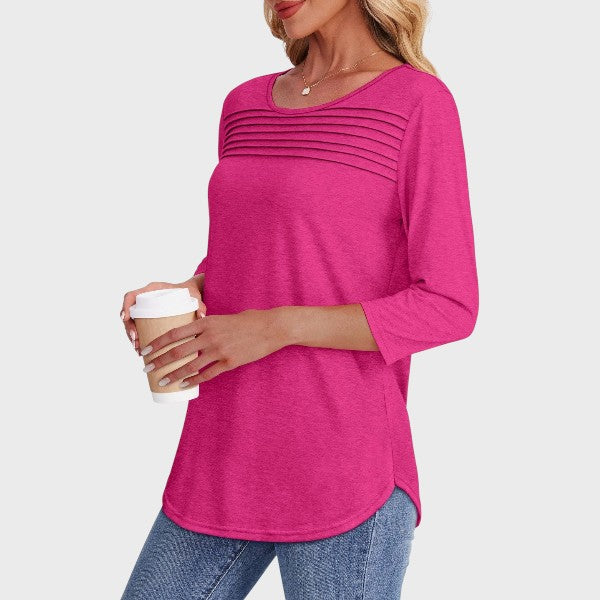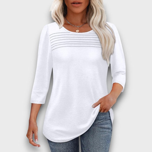 Ανακαλύψτε μια μπλούζα που συνδυάζει άνεση και στυλ με απόλυτη αρμονία. Η Πλισέ Μπλούζα Μόνα 3/4 Μανίκι διαθέτει λεπτές πτυχώσεις πάνω από το στήθος, προσθέτοντας μια πινελιά κομψότητας στην καθημερινή σας γκαρνταρόμπα. Τα κολακευτικά μανίκια 3/4 προσφέρουν την τέλεια ισορροπία κάλυψης και αναπνοής, καθιστώντας αυτό το ευέλικτο κομμάτι ιδανικό για χρήση όλο το χρόνο. Είτε είναι ντυμένη κομψά είτε casual, είναι ένα απαραίτητο κομμάτι για κάθε ντουλάπα.