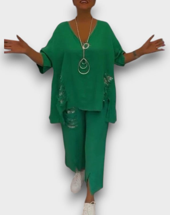 Αυτός ο αέρινος συνδυασμός περιλαμβάνει μια ριχτή μπλούζα και φαρδιά παντελόνια, ιδανικά για κάθε περίσταση.