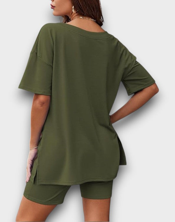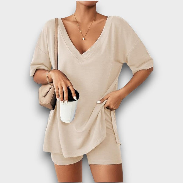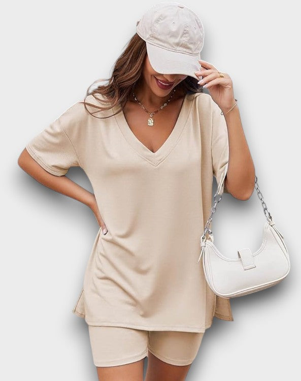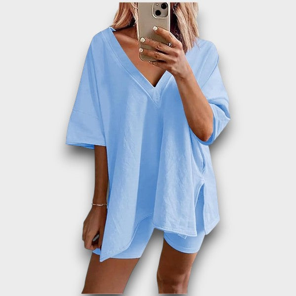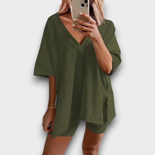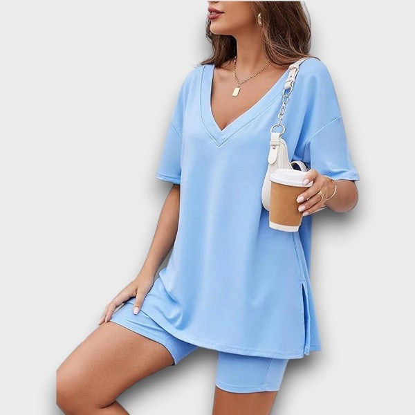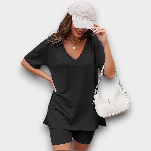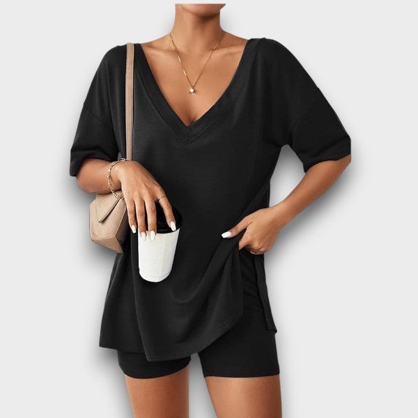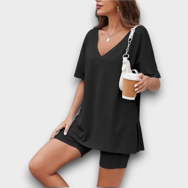 • Σετ 2 τεμαχίων: υπερμεγέθη μπλούζα με V λαιμόκοψη + ψηλόμεσο ποδηλατικό σορτς