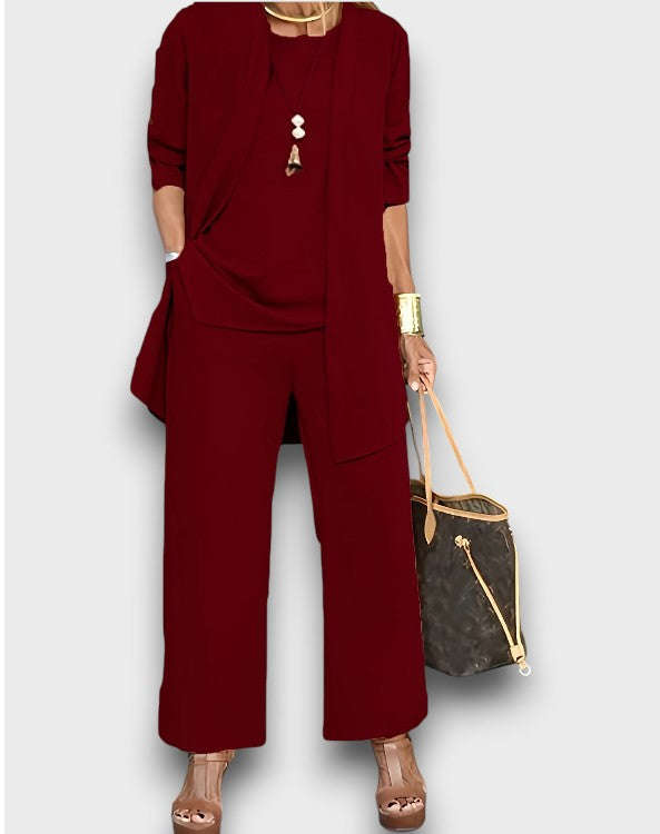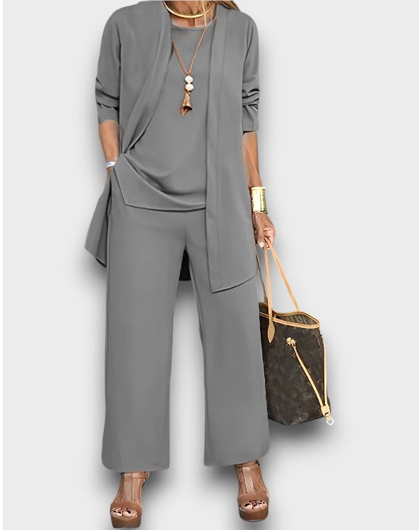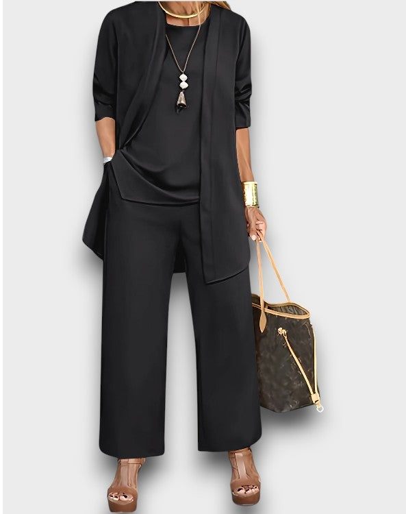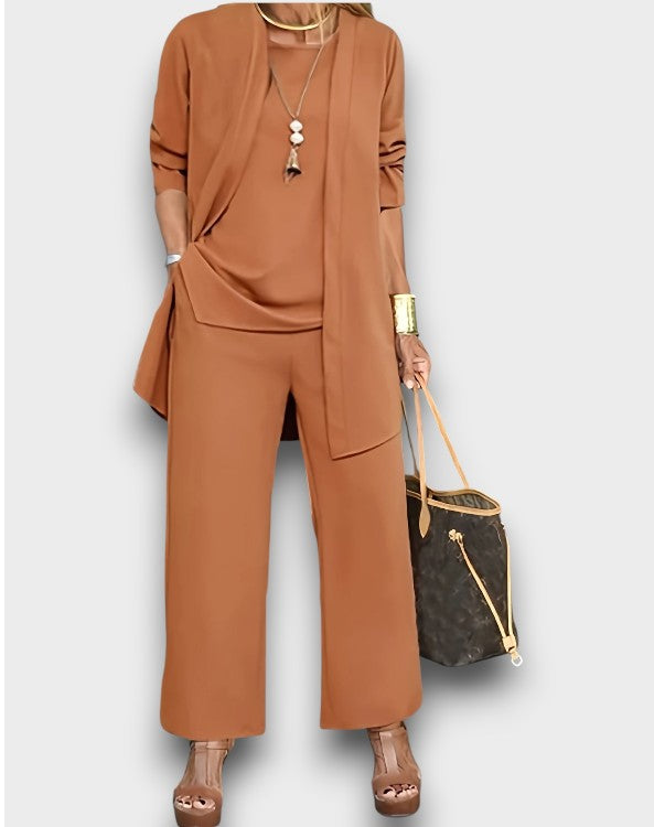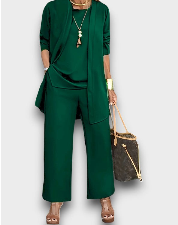 Εισέλθετε σε έναν εκλεπτυσμένο στυλ με το Νάιλα | Σετ Πολυτελείας Ραμμένο — Ένα κομψό σετ τριών τεμαχίων, σχεδιασμένο για τις σύγχρονες και αυτοπεποίθητες γυναίκες. Ιδανικό για το γραφείο, το μεσημεριανό γεύμα ή μια χαλαρή βραδιά στην πόλη, το Νάιλα προσφέρει κομψότητα και άνεση καθ' όλη τη διάρκεια της ημέρας.