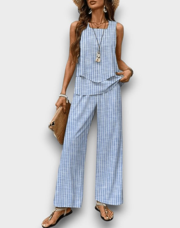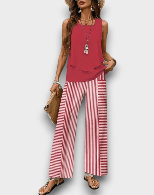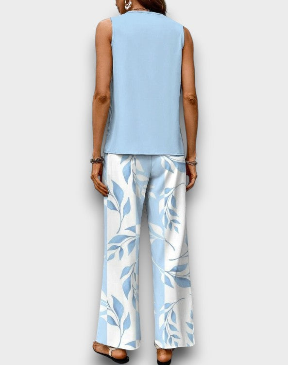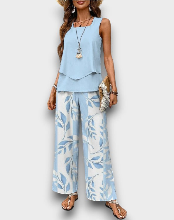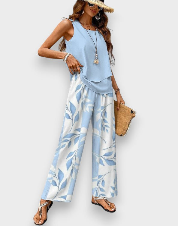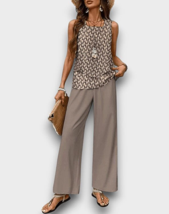 Εισέλθετε στην αβίαστη καλοκαιρινή κομψότητα με το Κομψό Καλοκαιρινό Σετ Παναγιώτα!Αυτό το στυλάτο σύνολο διαθέτει μια ροής τοπ και παντελόνια με φαρδιά πόδια, σχεδιασμένα για να σας κρατούν δροσερούς και κομψούς για κάθε ζεστή περίσταση.