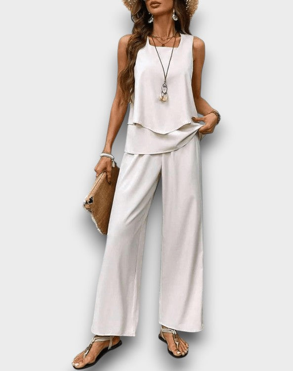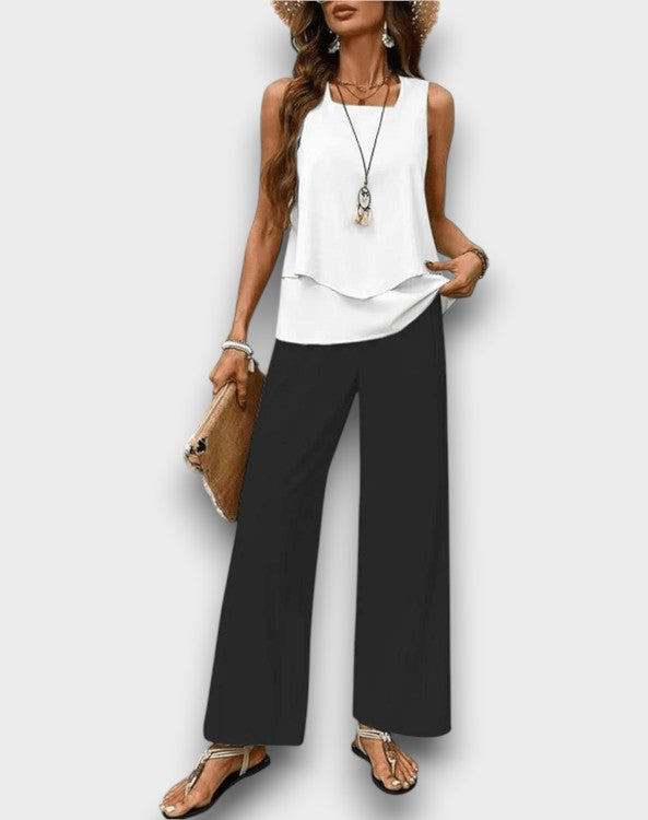 • Κομψό Πολυεπίπεδο Τοπ: Ο πολυεπίπεδος σχεδιασμός του αμάνικου τοπ προσθέτει μια εκλεπτυσμένη πινελιά, κατάλληλο για χαλαρές εξόδους ή πιο επίσημες εκδηλώσεις.