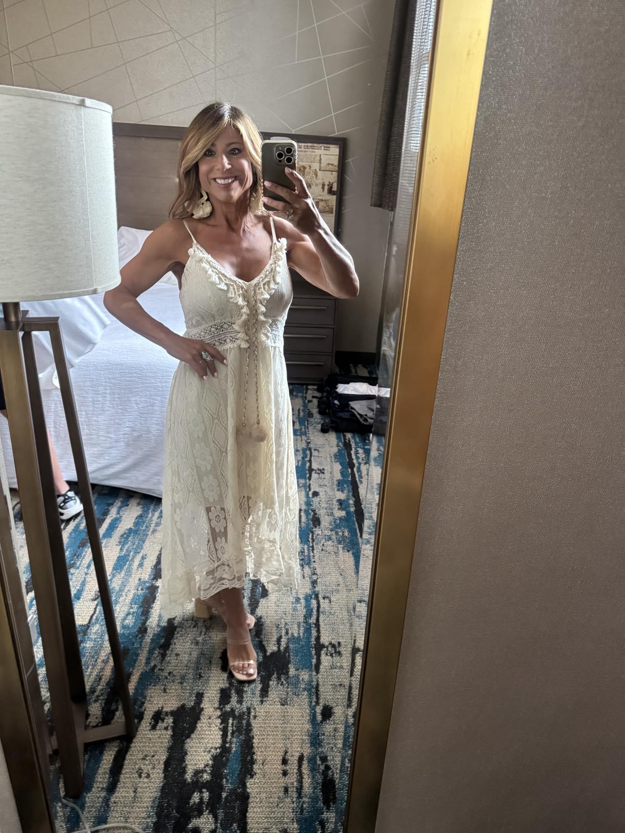 ✔ Διακριτική λάμψη – Με το βαθύ ντεκολτέ και τα ντελικάτα λουλουδάτα μοτίβα, τραβά την προσοχή στους ώμους και το μπούστο — χωρίς να γίνεται υπερβολικό.