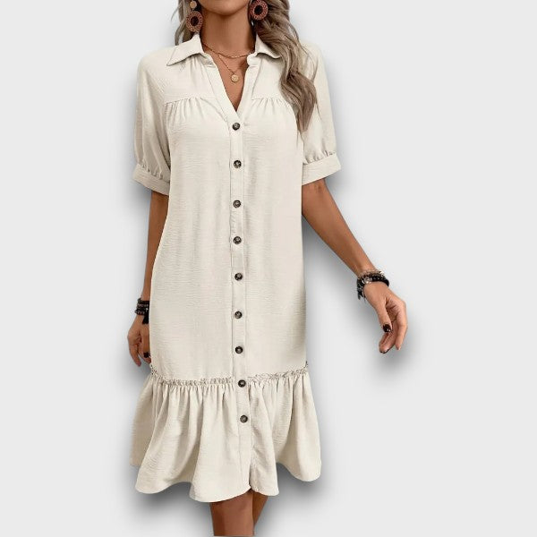 •Ίσιο κόψιμο με κουμπιά μπροστά και διακριτικά φαρδύτερη γραμμή προς τα κάτω για άνεση και θηλυκότητα.
