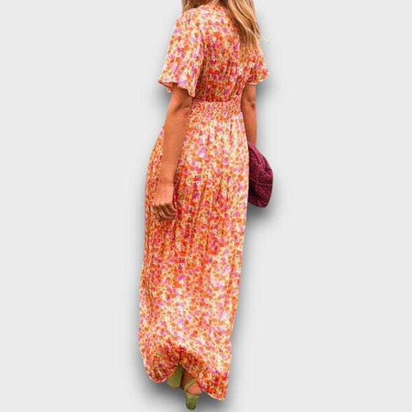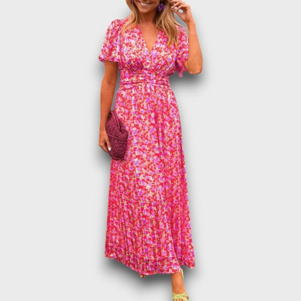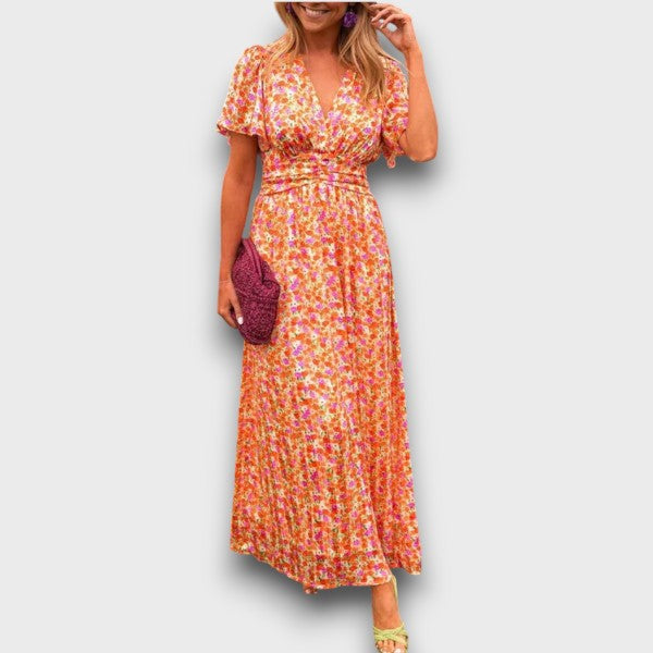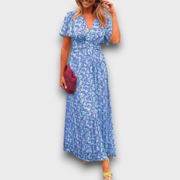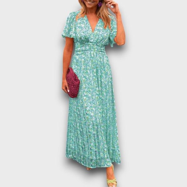 •Γυναικείο φόρεμα με ντεκολτέ V, τονισμένη μέση και φαρδιά, αέρινη φούστα