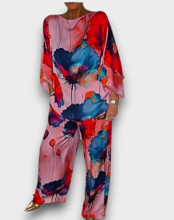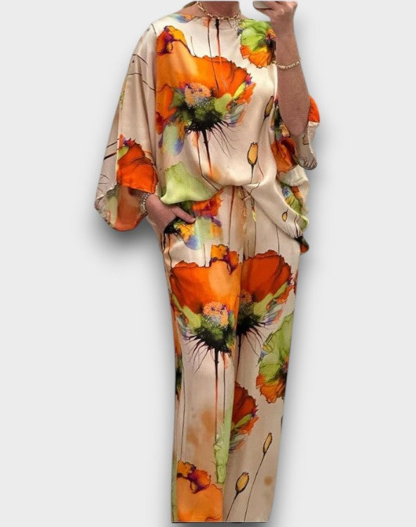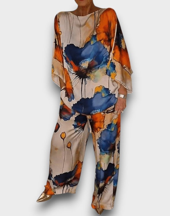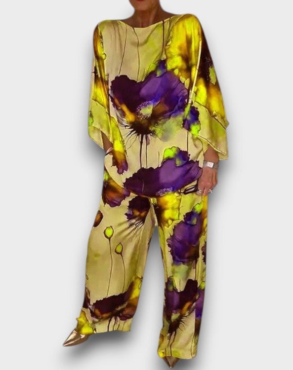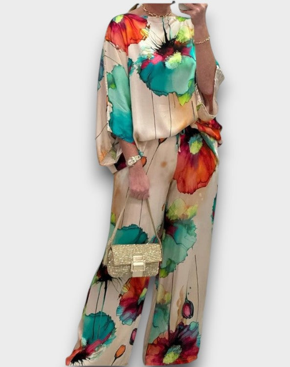 - Σχέδιο Σετ Δίδυμων: Περιλαμβάνει ένα ρευστό τοπ και φαρδιά παντελόνια για μια κομψή εμφάνιση.