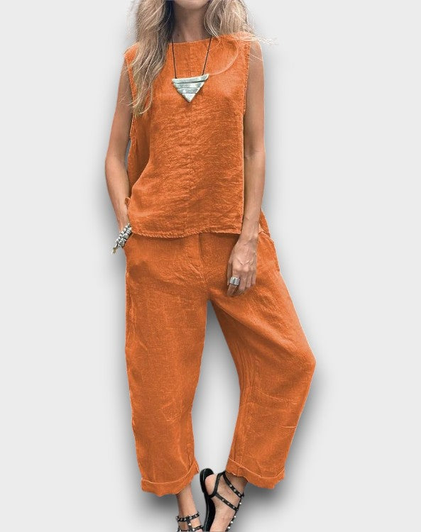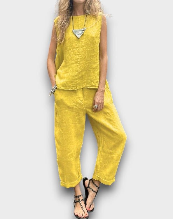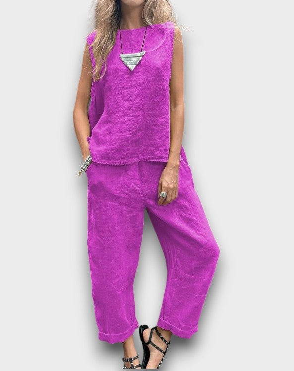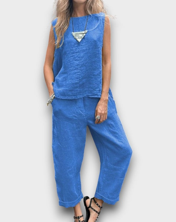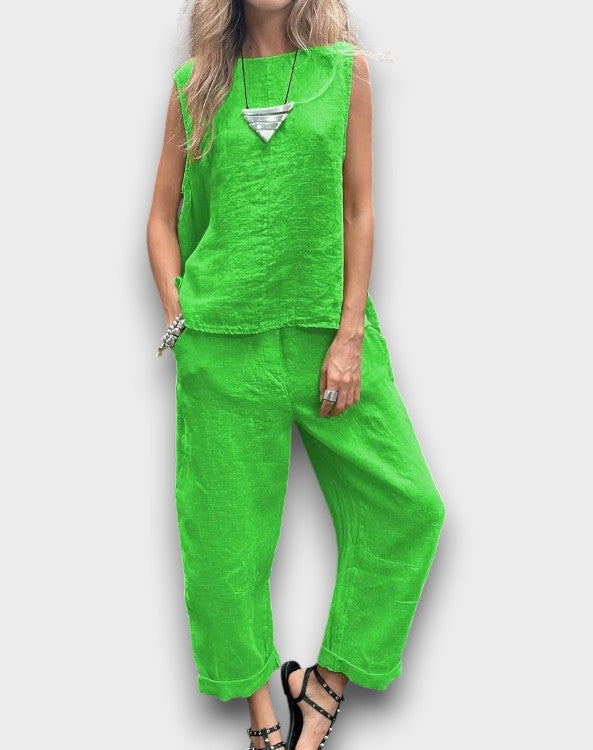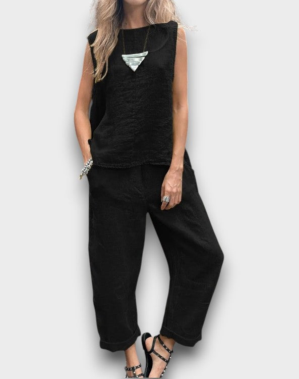 - ✔ Αβίαστα Στυλάτο – Ένα τέλεια ταιριαστό αμάνικο τοπ και παντελόνι μέχρι τον αστράγαλο για μια άψογη, προσεγμένη εμφάνιση.