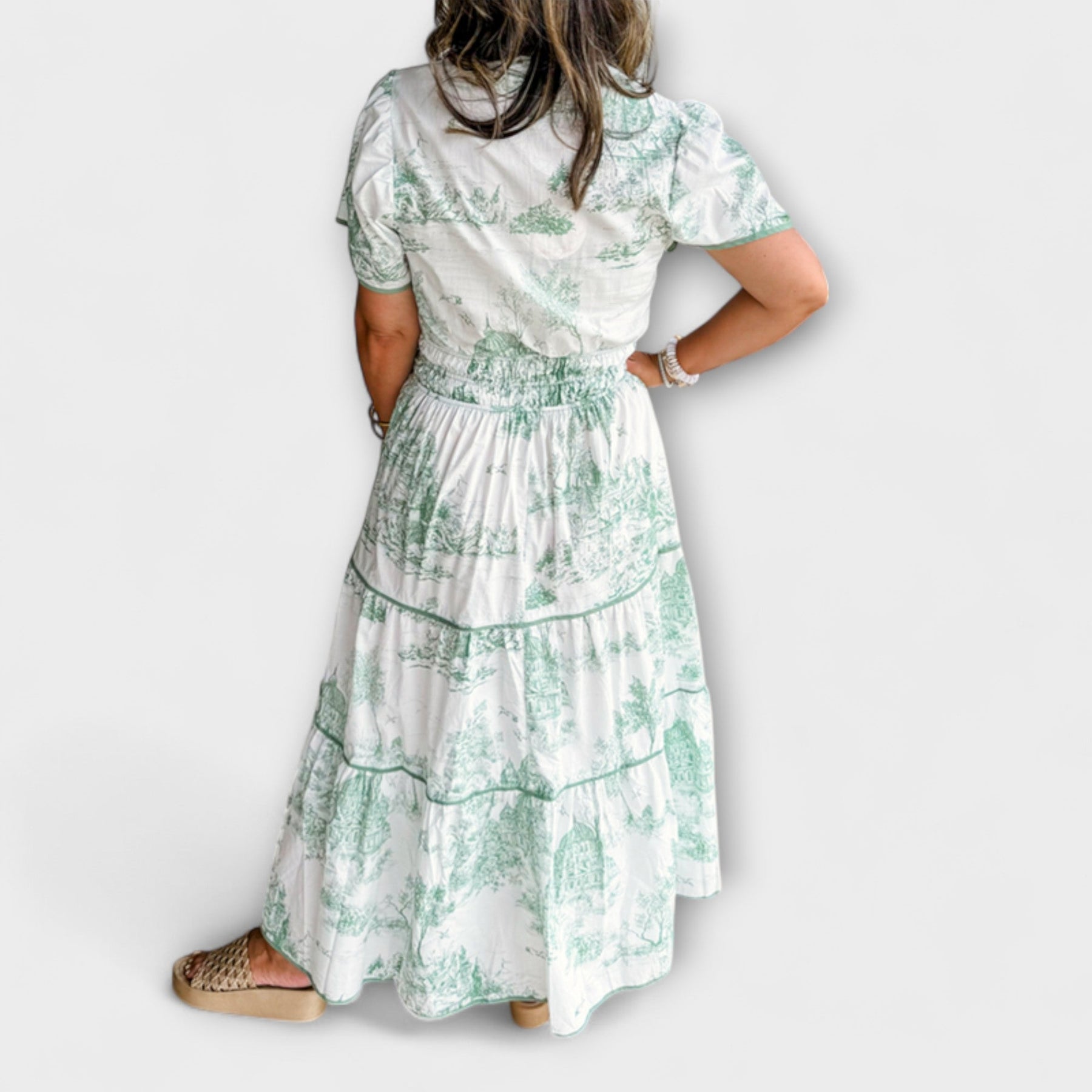Παρουσίαση του Eliza | Κλασικό Maxi Φόρεμα Toile – Ο τέλειος σύντροφος για τις ανοιξιάτικες μέρες και τις κηπουρικές γιορτές! Αυτό το διαχρονικό κομμάτι συνδυάζει την effortless κομψότητα με την απόλυτη άνεση και διαθέτει μια εκπληκτική πράσινη-λευκή εκτύπωση Toile που αποπνέει κλασική ρομαντική ατμόσφαιρα.